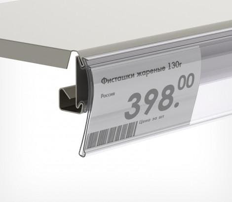 Устанавливается на полки с С-образным профилем на торце: KIFATO, LA FORTEZZA, ALSER и подобных. Гибкое крепление обеспечивает откидывание ценника вверх.
