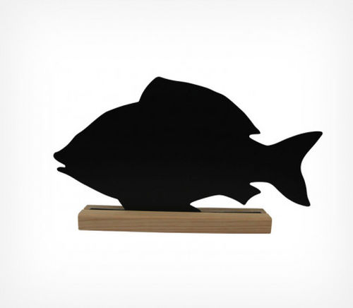 Черная фигурная табличка формата А4 в форме рыбы. Сделана из вспененного ПВХ 3 мм. Используется для написания мелом или маркером ценников и любых рекламных сообщений. Надписи стираются влажной губкой. Идеально подойдет для использования в рыбном отделе. Можно использовать совместно с деревянной подставкой.