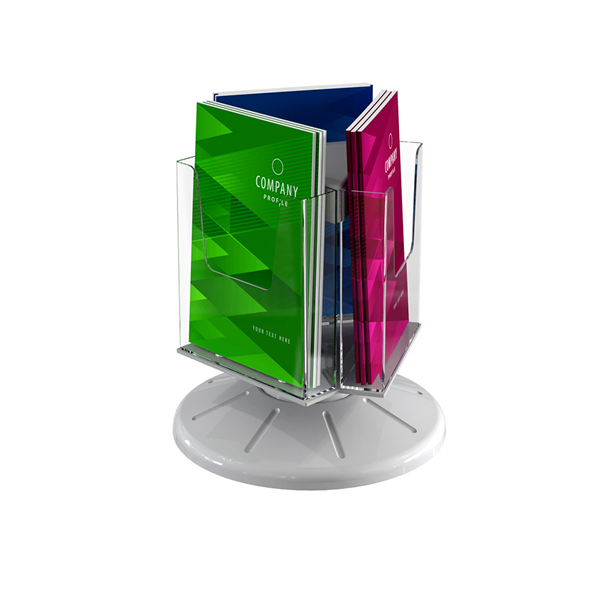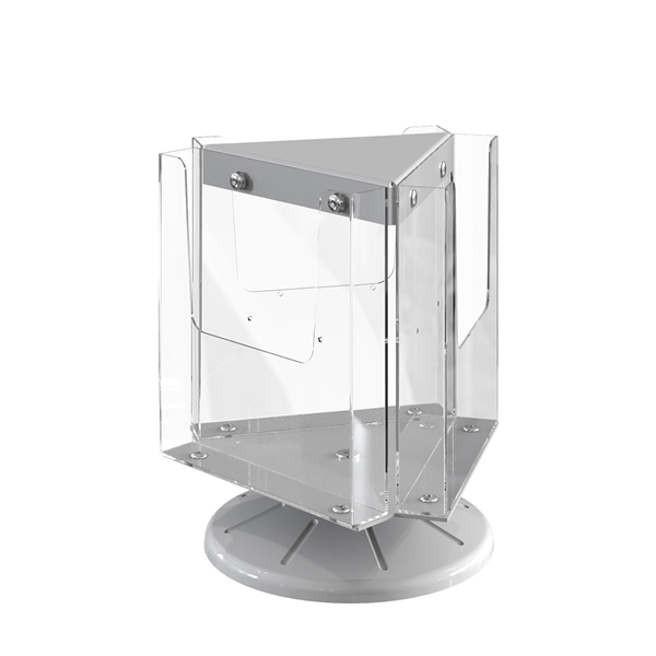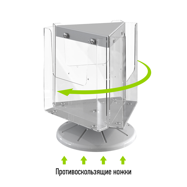 Держатель буклетов настольный Трио" А-5, 3-секции. Буклетница настольная трехсекционная А-5 вращающаяся платформа. Каждый из 3-х секций-кармана закреплен на основании из литьевого полистирола и вращается по часовой и против часовой стрелки. Это полезная опция для посетителя офиса и культурного заведения.