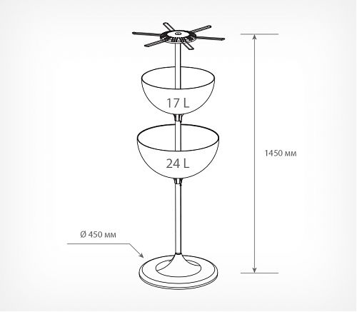 Дисплей UNIBOWL-17-24-HP-6 — это компактный дисплей с двумя чашами объёмом 17 и 24 литра и платформой с крючками.
