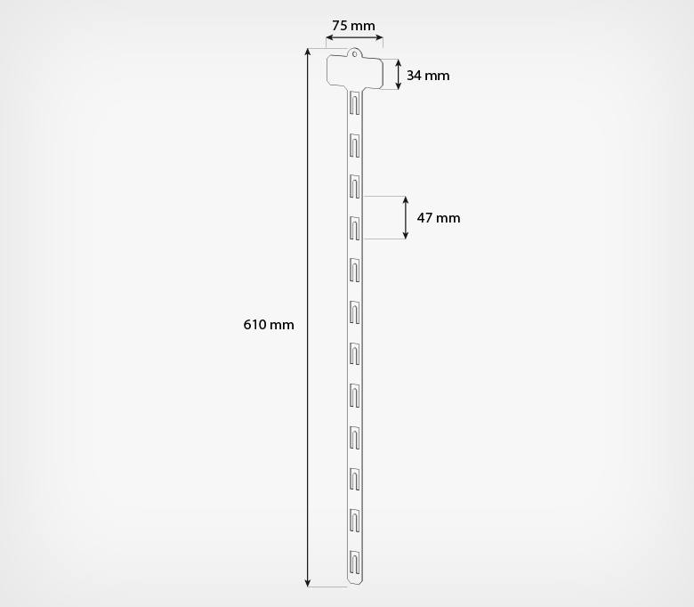 12 пластиковых крючков-фиксаторов расположенных с шагом 47 мм обеспечивают надежное и удобное размещение товаров на ленте. Верхняя часть ленты оснащена топпером для крепления ценников или рекламных наклеек. Дополнительно, в верхней части ленты предусмотрено отверстие для крепления с использованием специального металлического крючка для страйп-лент или хомута.